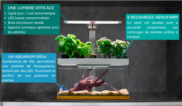 L’aquaponie a fait ses preuves depuis quelques années, mais il est rare de la voir pratiquée à l’échelle de l’aquariophilie. Nenufarm, est un concept complet d’aquarium et potager à herbes aromatiques ou petites plantes d’intérieur.