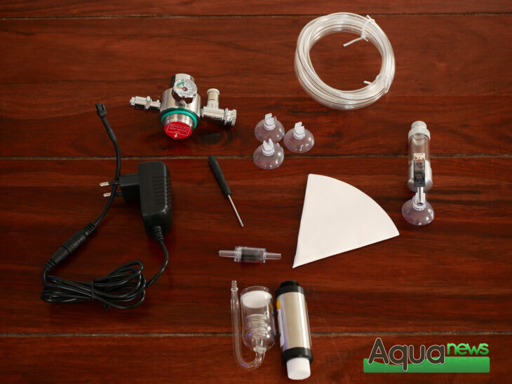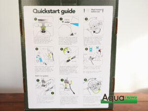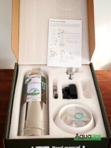 Le Colombo CO2 Reactor s’inscrit dans les critères « Pro Aqua Scape » de la marque. Au dos de la boîte, l’ensemble des étapes sont inscrites pour une totale transparence pour l’aquariophile. Ce qui montre également la simplicité de sa mise en place. A l’ouverture, les différents éléments sont présentés dans une mousse compartimentée pour assurer leur intégrité. Il s’agit d’un kit rechargeable basé sur une réaction chimique entre deux éléments en poudre. Ainsi, les déchets généralement induits pas les kits à bouteilles jetables sont réduits à l’emballage des deux réactifs en sachets. Il peut également être plus simple de se procurer ces recharges en sachets que de trouver une boutique où remplir les bouteilles de CO2 classiques.
