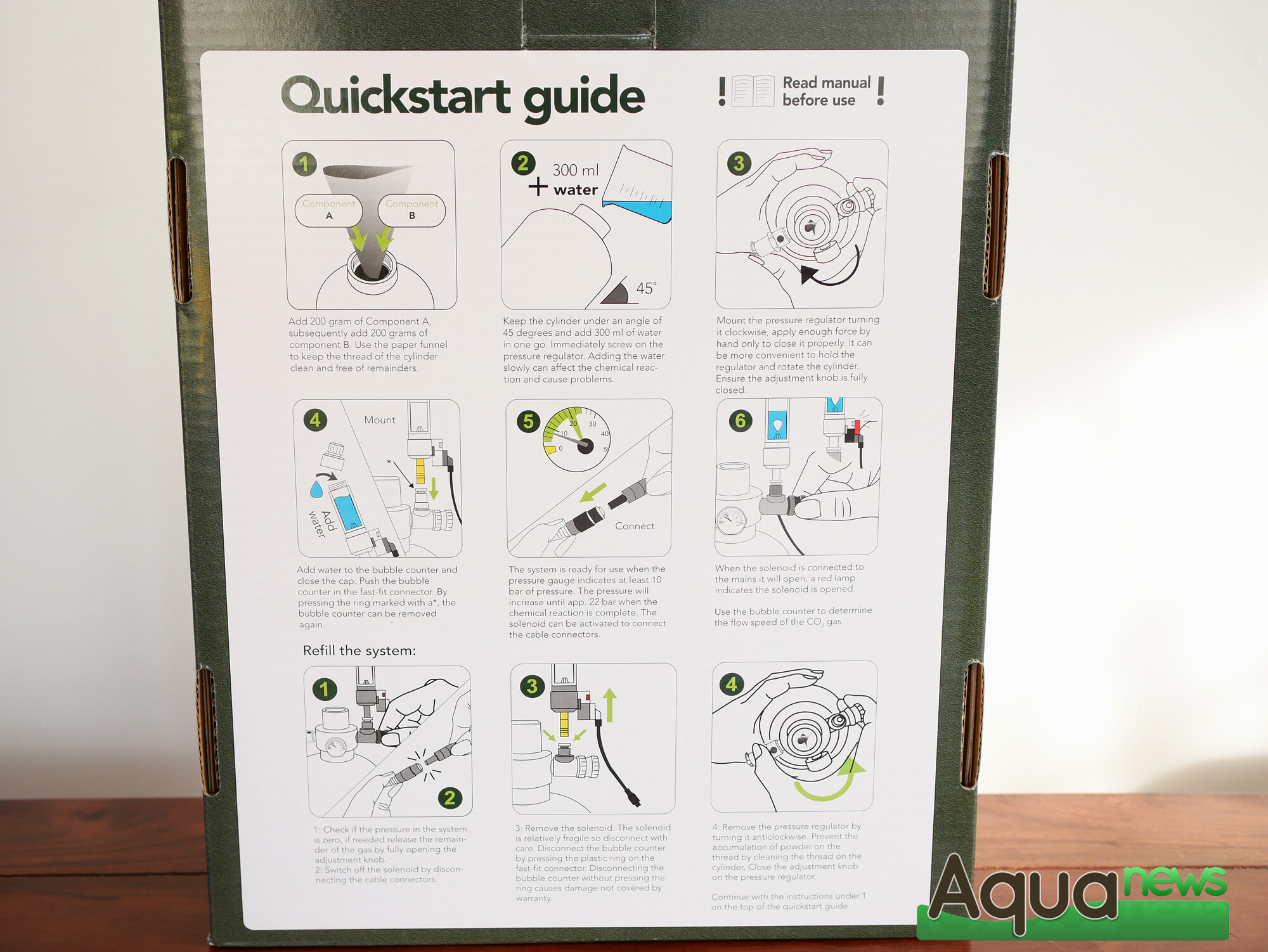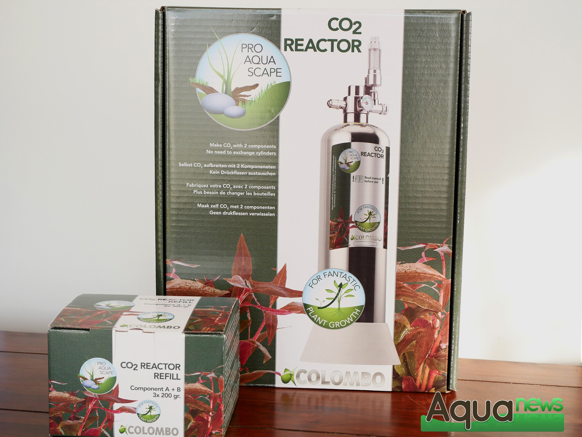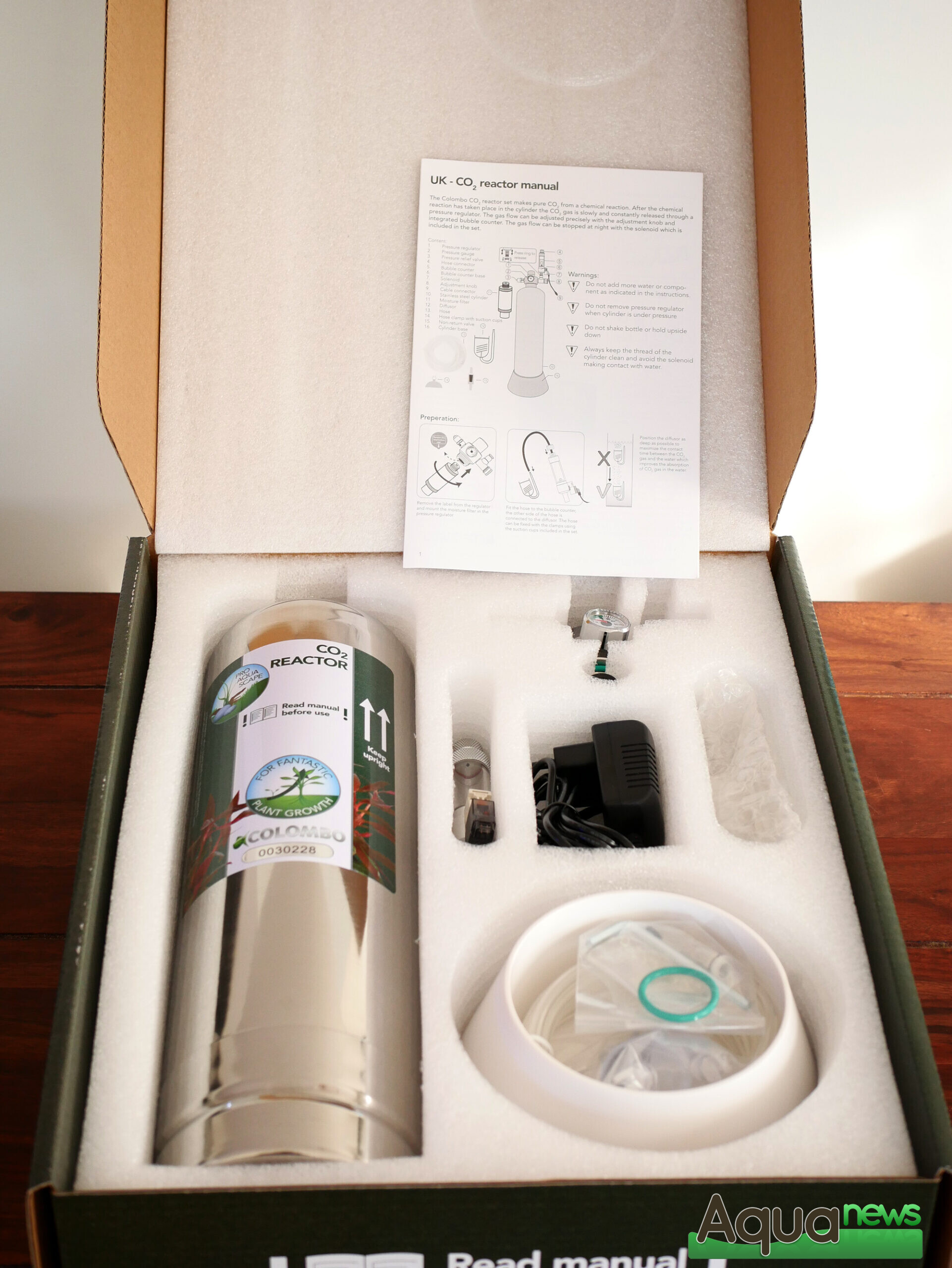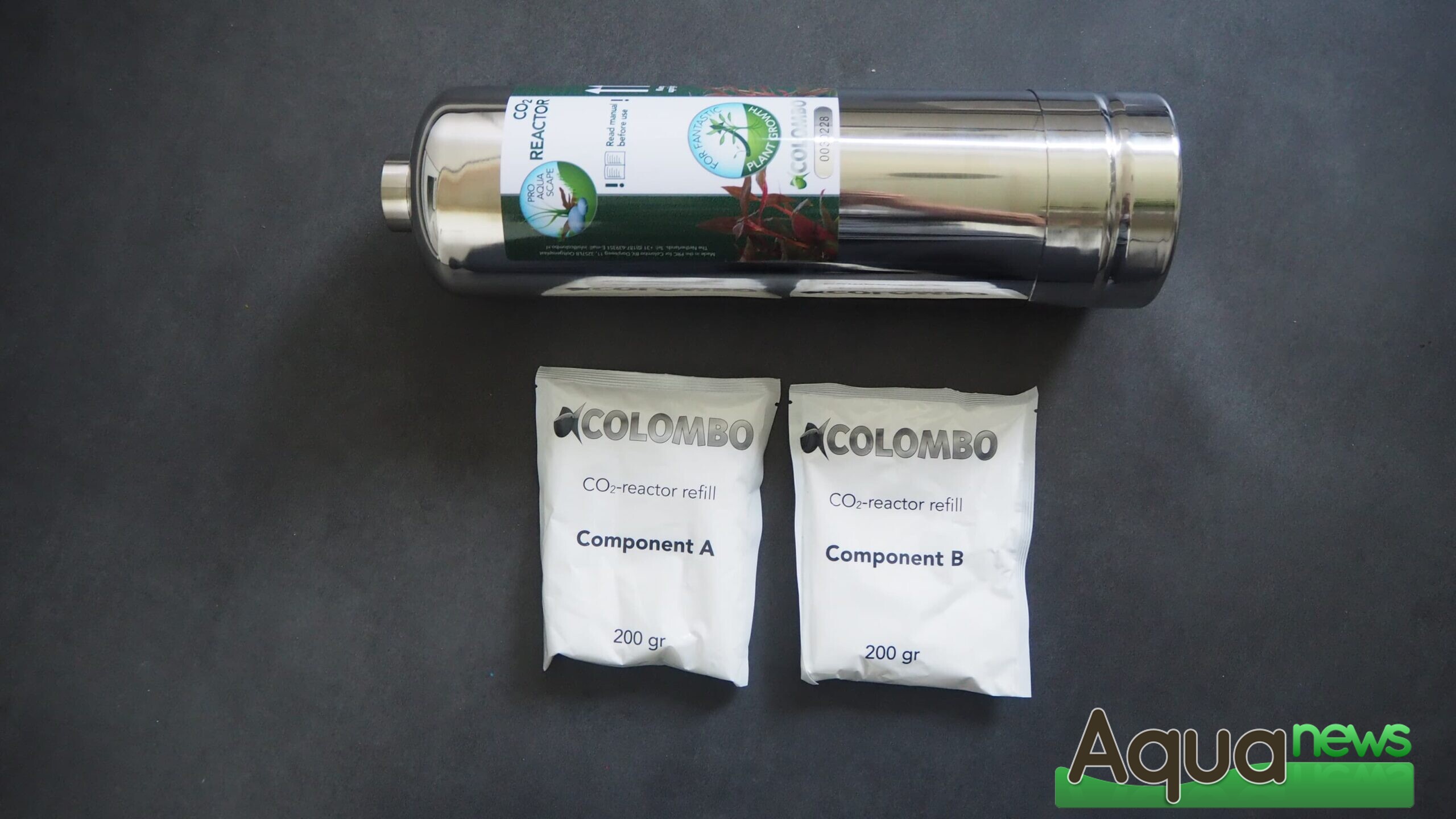 Le Colombo CO2 Reactor s’inscrit dans les critères « Pro Aqua Scape » de la marque. Au dos de la boîte, l’ensemble des étapes sont inscrites pour une totale transparence pour l’aquariophile. Ce qui montre également la simplicité de sa mise en place. A l’ouverture, les différents éléments sont présentés dans une mousse compartimentée pour assurer leur intégrité. Il s’agit d’un kit rechargeable basé sur une réaction chimique entre deux éléments en poudre. Ainsi, les déchets généralement induits pas les kits à bouteilles jetables sont réduits à l’emballage des deux réactifs en sachets. Il peut également être plus simple de se procurer ces recharges en sachets que de trouver une boutique où remplir les bouteilles de CO2 classiques.