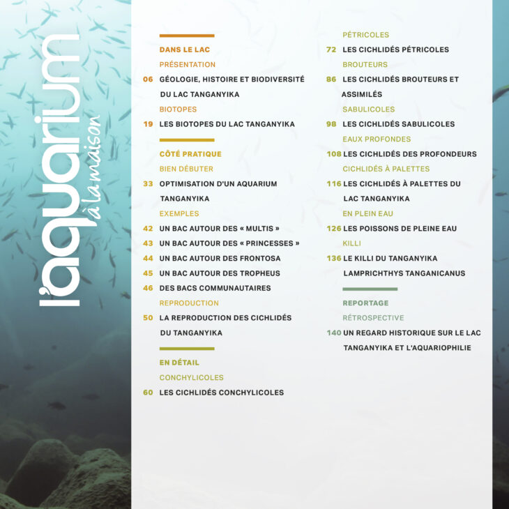 C’est un numéro exceptionnel qui ravira tous les cichlidophiles, mais aussi tous les amateurs passionnés par les biotopes naturels et les amoureux de belles photos subaquatiques. Car un nombre plus que substantiel d’images ont été prises dans le lac Tanganyika lui-même. Parmi les photographes réputés, on peut signaler Ad Konings (qui signe d’ailleurs la couverture de ce Hors-Série, avec une photo de Neolamprologus pulcher « Daffodil » prise in situ), les frères Karlsson ou encore Benoît Jonas.
