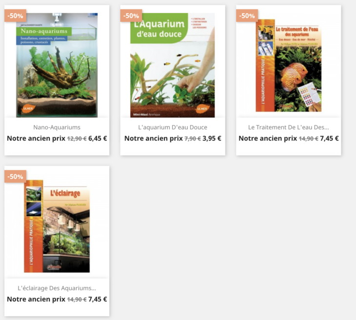 Pour les livres, nous proposons des ouvrages sur les Nanos aquariums, très en vogue pour animer un petit espace chez vous, ou l’aquarium en général. Mais aussi sur l’éclairage ou les paramètres de l’eau. Enfin, un livre dédié au poisson rouge permet d’éviter les erreurs chez ce poisson que l’on a tous maintenu, ou encore le classique scalaire.