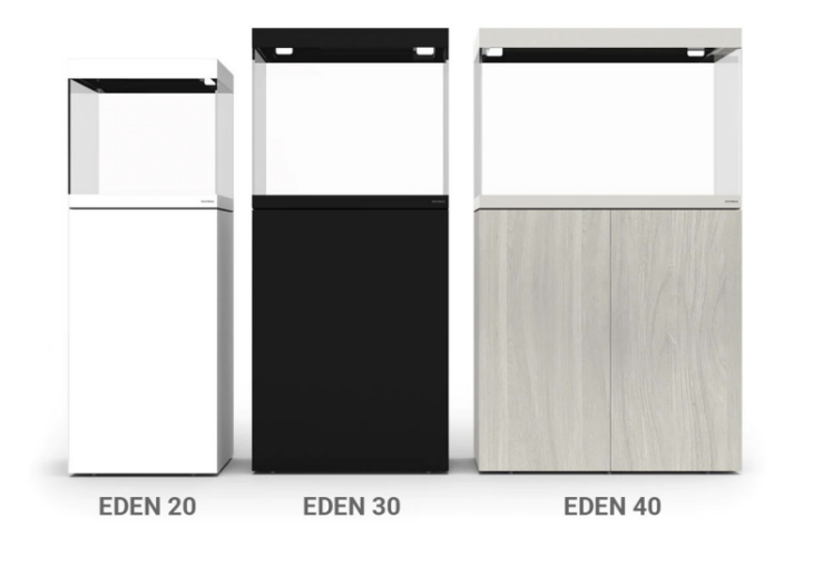 Les aquariums Waterbox EDEN sont des ensembles de cuve avec galerie/couvercle et meuble, disponibles en 3 coloris (blanc, noir et peuplier) et 3 tailles (20, 30 et 40 gallons soient 77L, 111 L et 150L).