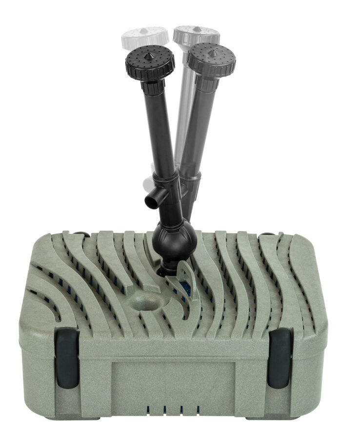 - Filtrapond 4000 : Débit de 4000 L/h – Poussée maximale : 3,1 m – Consommation : 70 W – Puissance UVC : 13 W – Surface de filtration : 2 000 cm2 – Taille de bassin recommandé : jusqu’à 10 000 L – Prix moyen constaté : 429 €