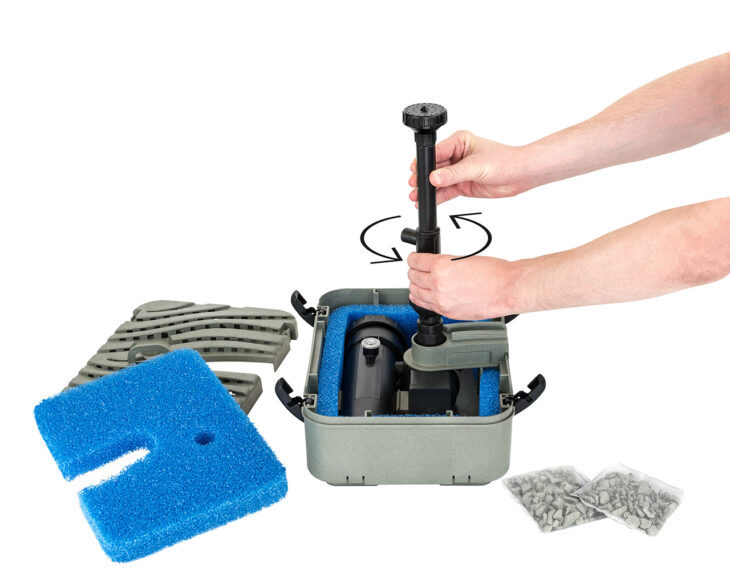 La sortie d’eau est rotative, permettant d’orienter le jet d’eau. D’ailleurs, il est possible d’ouvrir et d’entrenir le filtre sans la retirer. De la même façon, le filtre UVC est facilement extractable sans défaire l’ensemble du filtre. Un indicateur lumineux vous permet de garder un oeil sur le bon fonctionnement de l’ampoule UV.