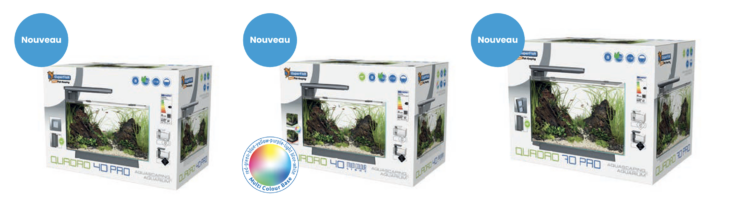 - Quadro 40 PRO : Volume de 28 L – Dimensions (L x l x h en cm) : 45 x 25 x 35,7 – Eclairage de 12 W mixant LED blanches et bleues qu’il est possible de régler selon 3 niveaux d’intensité – Filtre Corner Filter 50 – Prix de vente annoncé : 94,99 €