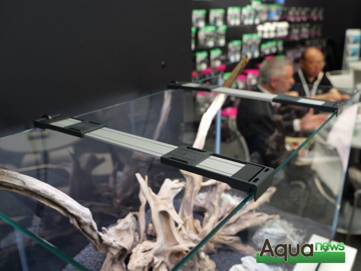 Tout d’abord, une nouvelle gamme d’aquariums cubiques surprenants, les Newa Ego. Au premier coup d’oeil, on pense à des aquariums « classiques », mais en y regardant de plus près, l’oeil se pose sur les vitres de couvertures, opaques, en blanc ou en noir, pourtant, l’aquarium est éclairé ! Il faut alors se pencher dessous pour comprendre : une barre LED ultra plate tient tout juste sous le verre, ce qui permet d’avoir un « tout-en-un » sans galerie rajoutant plusieurs centimètres au-dessus du niveau d’eau. Les cuves sont disposées sur un petit cadre les surélevant légèrement au-dessus du meuble, donnant une impression de cuve flottante selon l’angle d’observation. Trois volumes sont proposés : 20 (environ 26x27x30cm), 30 (environ 30x31x34cm)et 50 L (environ 36x36x39cm). Ils seront donc déclinés en version « tank », la cuve uniquement, « Lid », avec la vitre de couverture et l’éclairage, et « Full » avec un filtre interne adapté au volume.